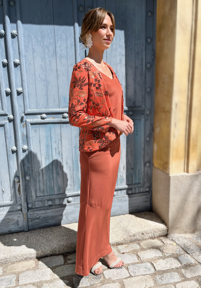 En base de lino azafrán con bordados en paillaits en bronce y y dorado.