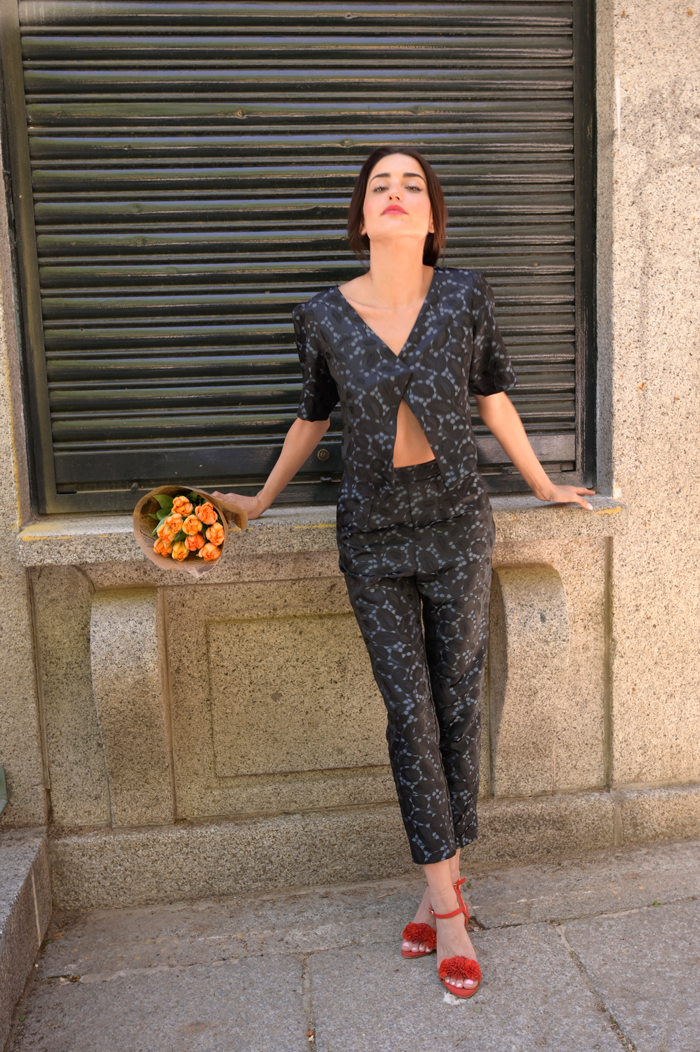 Cuerpo de lino y algodón estampado en tono salmón y detalles en gris.