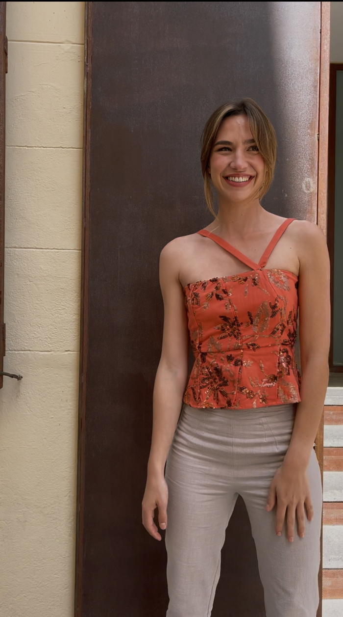 El cuerpo Marigold es ideal para todos tus eventos. Fácil de combinar tanto con falda como con pantalón. Tiene un patronaje muy elaborado ya que está formado por cortes que se acuestan sobre tablas. Confeccionado en un tejido muy especial, lino bordado en paillaits de flores en bronce y dorado.